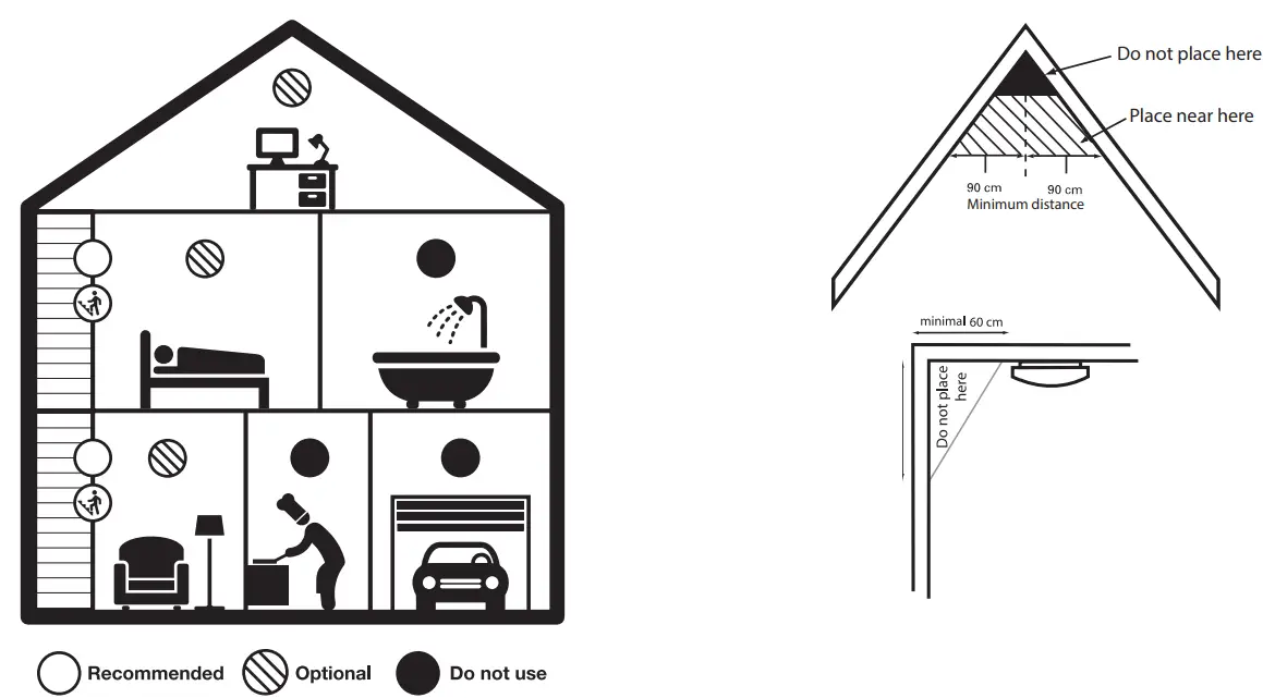 Install the detector on the ceiling. Except for rooms smaller than 1m, you should stay at least 50 cm away from the wall and 61cm from any corner. Smoke and heat do not gather in such corners, preventing the detector from alerting you on time.