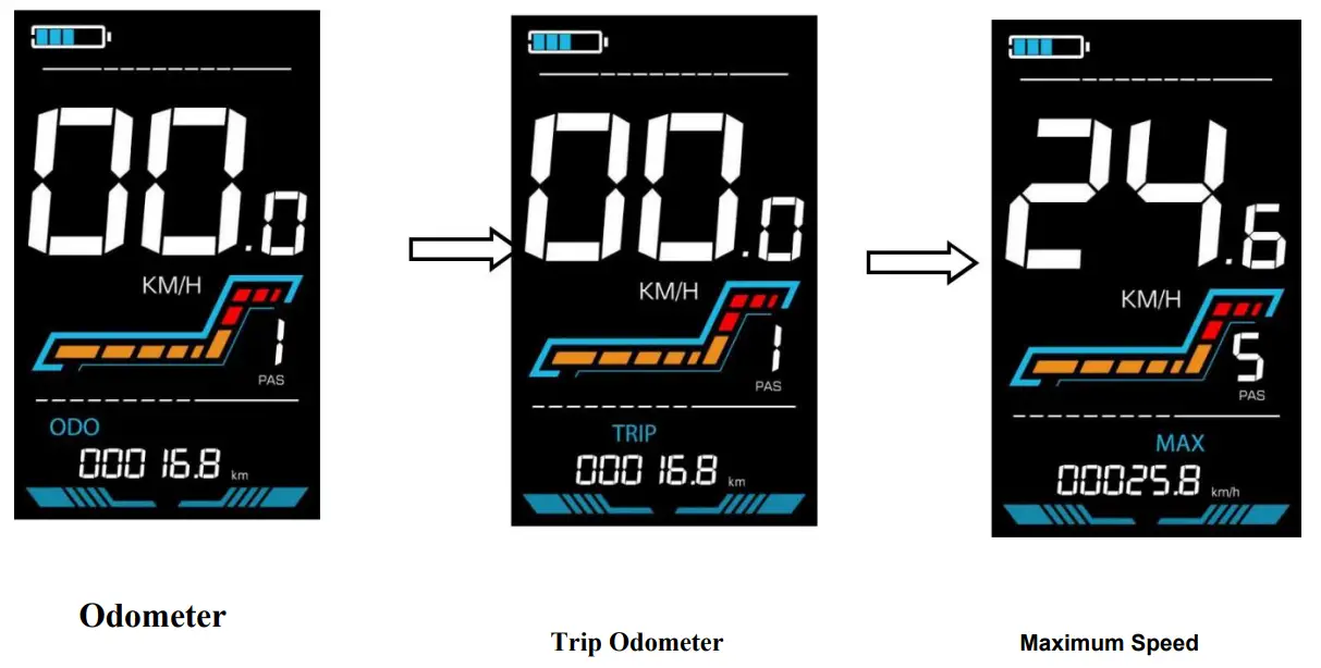 to switch between Odometer (km), Trip Odometer(km), Maximum Speed (km/h), and Average Speed (km/h).