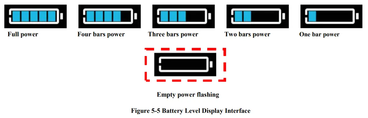 The Battery level is shown as 5 bars. When the battery is full charged, all of the 5 bars lighten up. When the battery is fully depleted, the bar will begin to flash, warning the user to charge the battery as soon as possible.