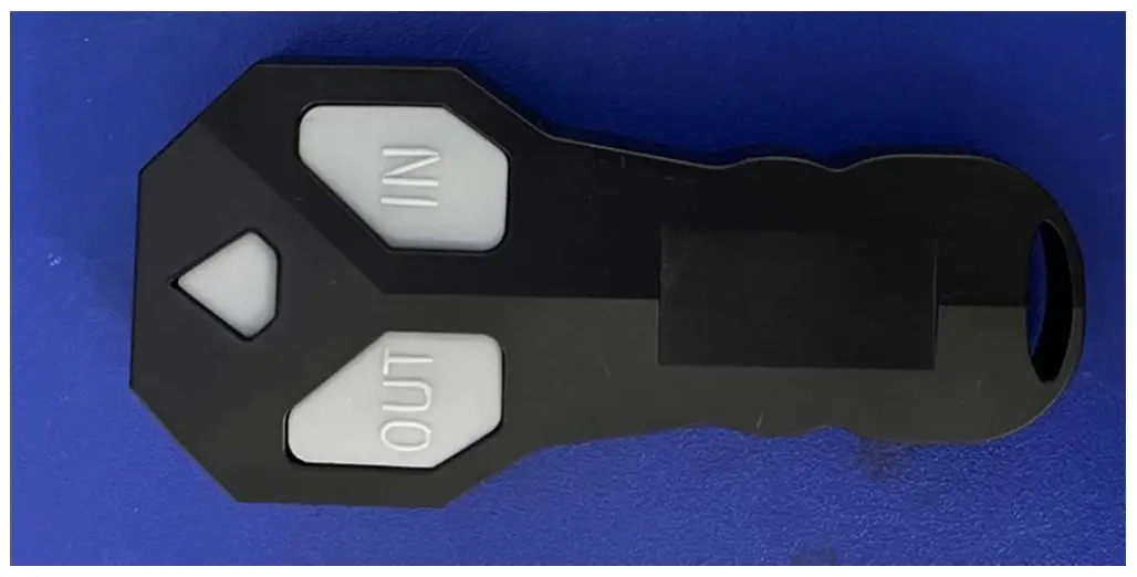 It has 2 key buttons. Press and hold both button more than 3 seconds, the remote powered on, while the LED indicator lights. Then press and hold on the key of “DOWN” or “UP”, it will trigger high frequency FSK modulation unit to transmit the ID code and key value. The high-frequency signal emitted by the antenna. When the remote control has been powered on, press and hold the both button more than 3 seconds, the remote control is turned off, while LED is off. If there is no key operation within 50 seconds, it will automatically shut down.