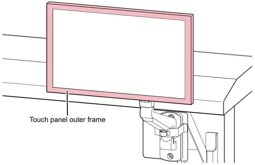 - The monitor arm equipped with a touch panel protrudes from the front of the machine. Take care to prevent injury by bumping into the monitor arm or touch panel while working