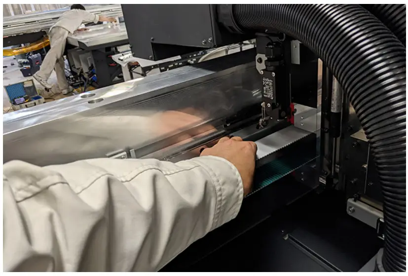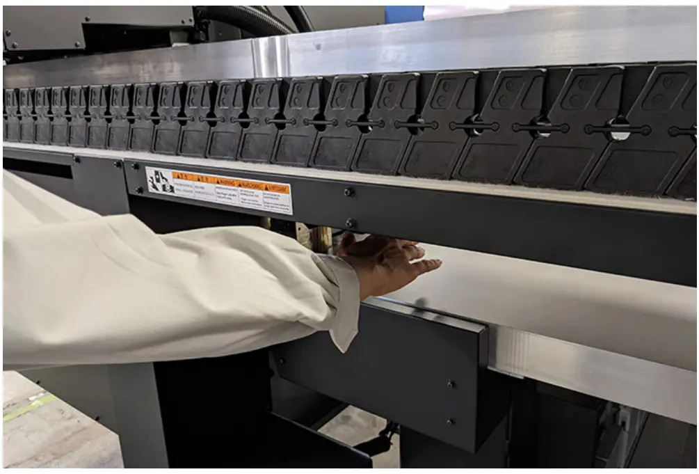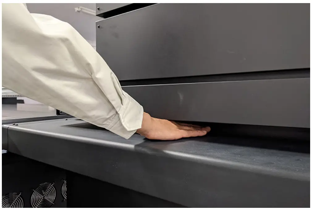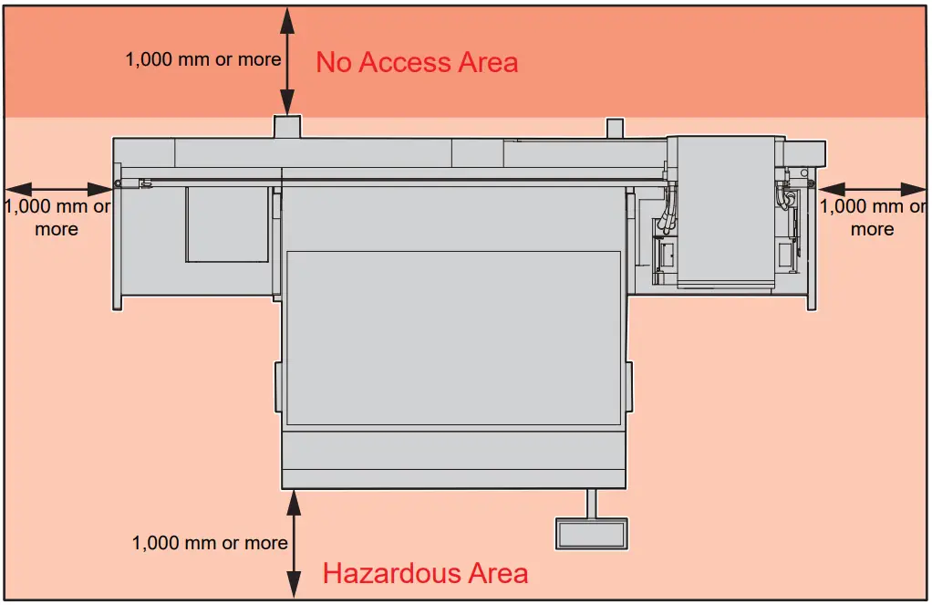 | - This machine poses significant safety hazards due to the high-speed movement of the carriage from side to side, Y-bar movements, sections with high temperatures and hazardous voltages, and the UV-LED. Use of the machine is restricted to operators with a thorough understanding of the hazards involved.