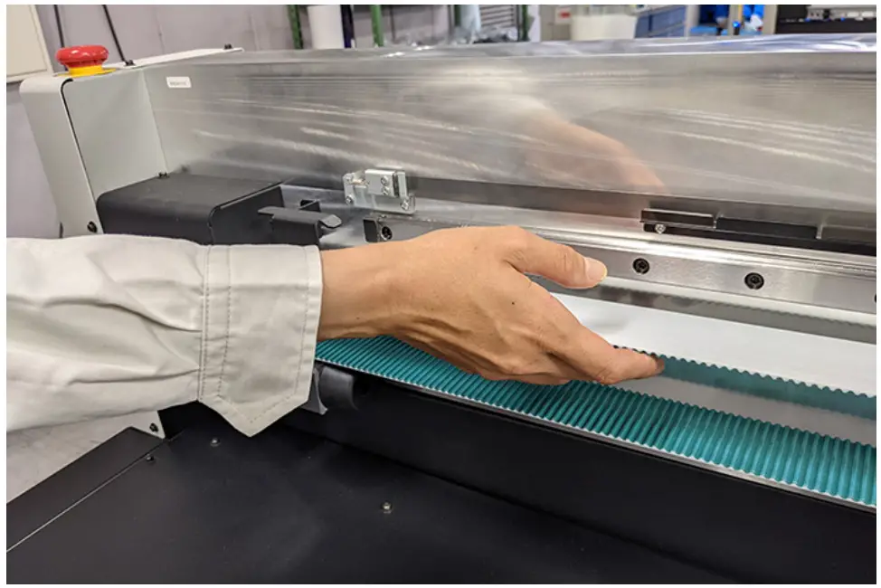 - Avoid touching the glass on the underside of the UV-LED unit with bare hands. Disregarding this precaution may impair UV ink curing. If the glass becomes dirty, wipe clean using a soft, clean cloth soaked with ethanol. Be careful to keep ethanol from splashing on the covers or other parts while cleaning. Disregarding this precaution may result in deformation or failure of the unit