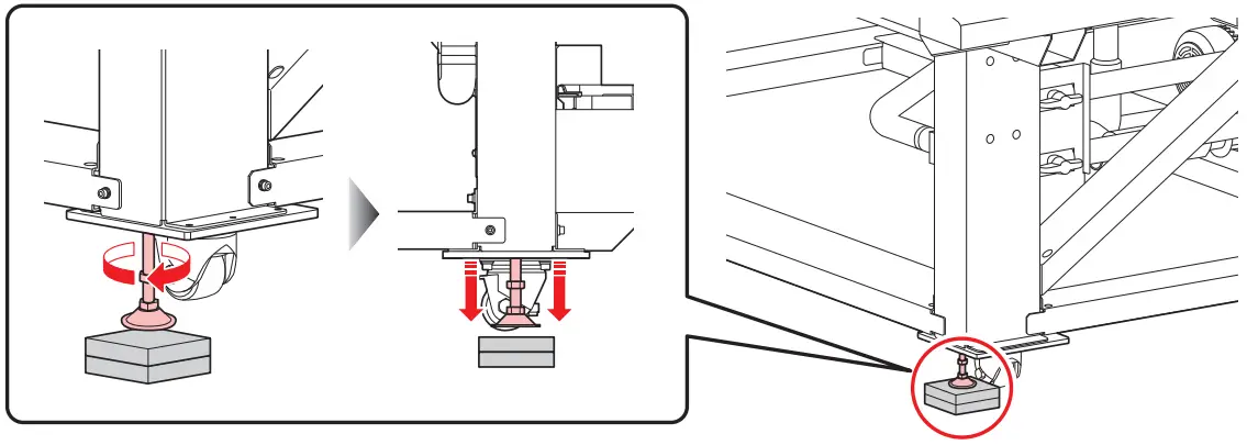 Before turning the machine on, make sure the adjuster feet are secured firmly. If any adjuster foot is loose, the machine may move during printing, resulting in injuries.