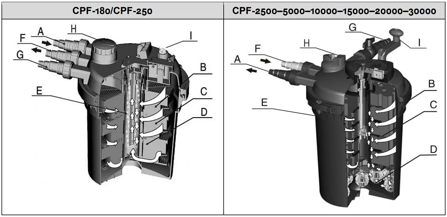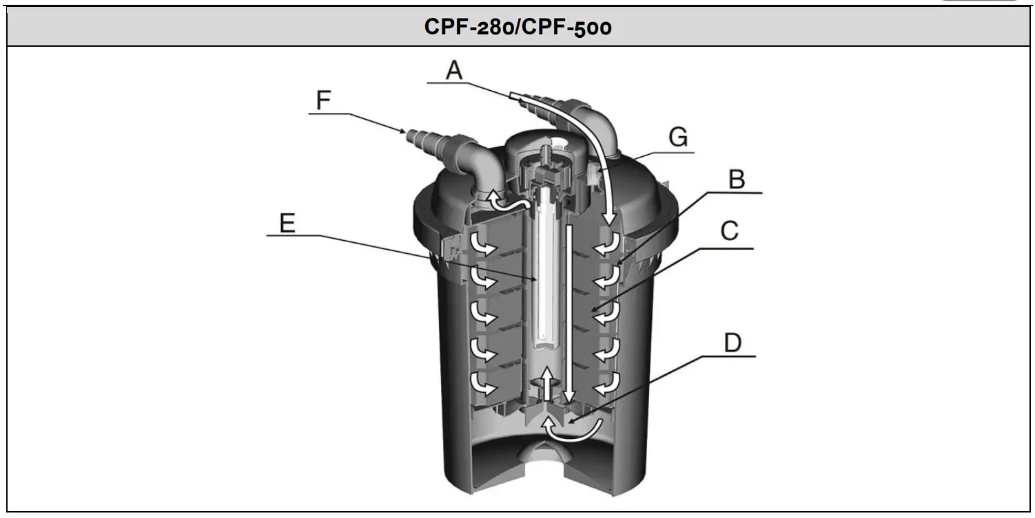 | E | Pre-cleaning of the pond water | When the water flows out, it is shortly exposed to the UV radiation emitted by the UV lamp. As a result, germs, bacteria, and algae are destroyed. The water circulates when flowing through the filter from inside outwards. |