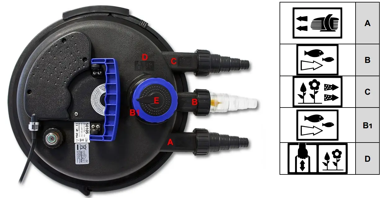 Filter operation: Bring the rotating switch E into position B1. With the help of a pump, the water is led to the filter through the connection A, where it is cleaned and discharged back into the pond via connection B.
