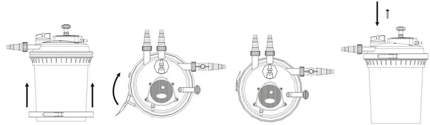 - The pond pressure filter must be horizontally fixed with screws on a suitable mounting place.