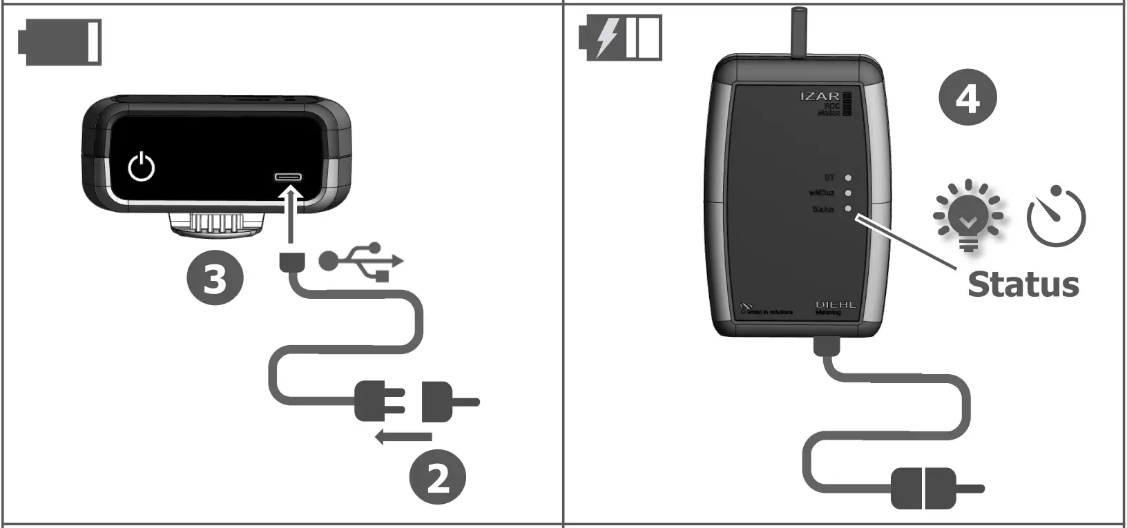 | Status | Green Red Yellow | Red: device is switched off, charging Red blinking: device is switched off and shows charging error Yellow: device is switched on and charging active Green/yellow blinking: device switched on and charging error Green: device is switched on, charging inactive |