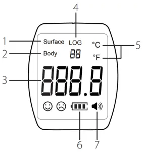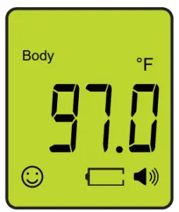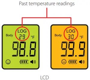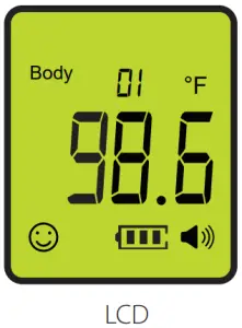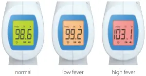 - Upon measuring the body temperature, the backlight color of the LCD display will be based on the test result. Refer to the Fever Alert System section for more information.