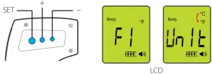 Press and hold the SET button for 3 seconds to enter the setting mode. F1 will be displayed. Press [+] to change to Celsius, or press [-] for Fahrenheit.