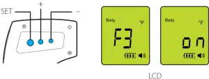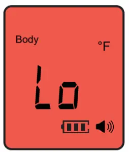 ![]() | If the body temperature is lower than 89.6°F /32.0°C (for surface if it’s lower than 32°F/ 0°C), “Lo” is displayed with a red backlight and 3 beeps. |