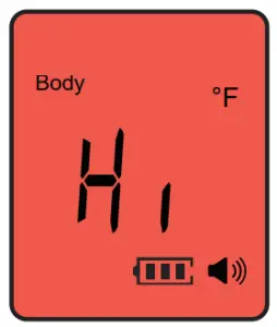 ![]() | If the body temperature is higher than 107.6°F /42.0°C (for surface if it’s higher than 176°F /80°C), “Hi” is displayed with a red backlight and 3 beeps. |