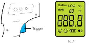 - Press the TRIGGER to turn the thermometer ON. The LCD display will light up Green and display all icons for about 1 second.