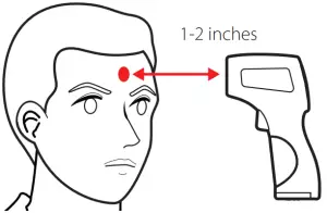 - Position the thermometer 1-2 inches away from the center of the forehead.