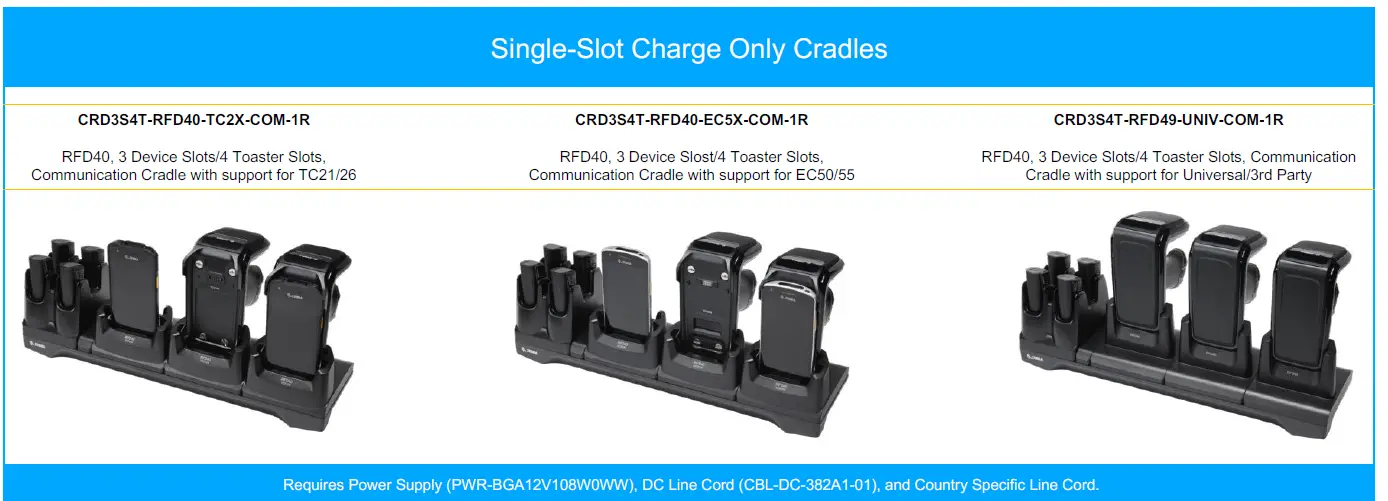- Charges 3 RFD40 Sled, 3 Mobile Computer (together or separately), and 4 spare batteries