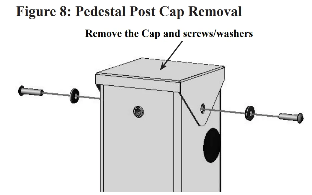- Secure the cap to the pedestal with the two (2) 1/4”- 20 x 1” Torx button head screws (with washers) using a T27 Torx driver.