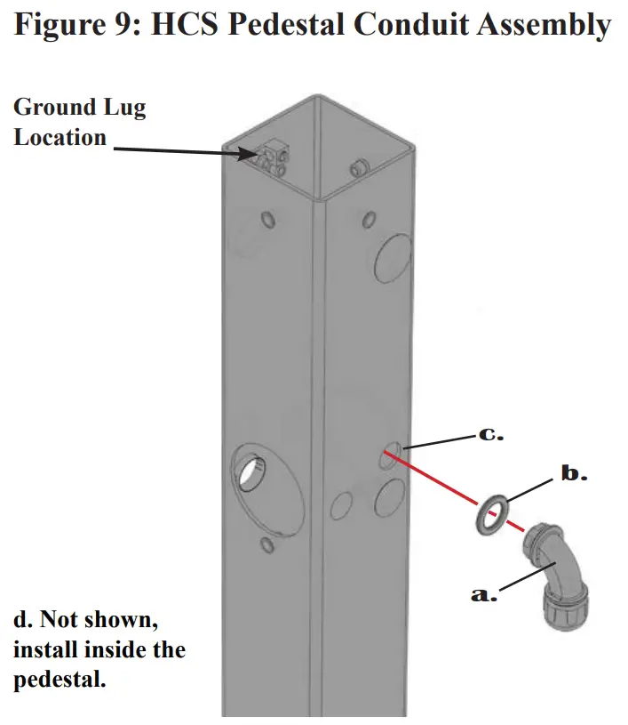 | 4013-0009 | 1 | Pedestal Conduit Assembly, Standard 90 degree 1/2” NPT Fitting |