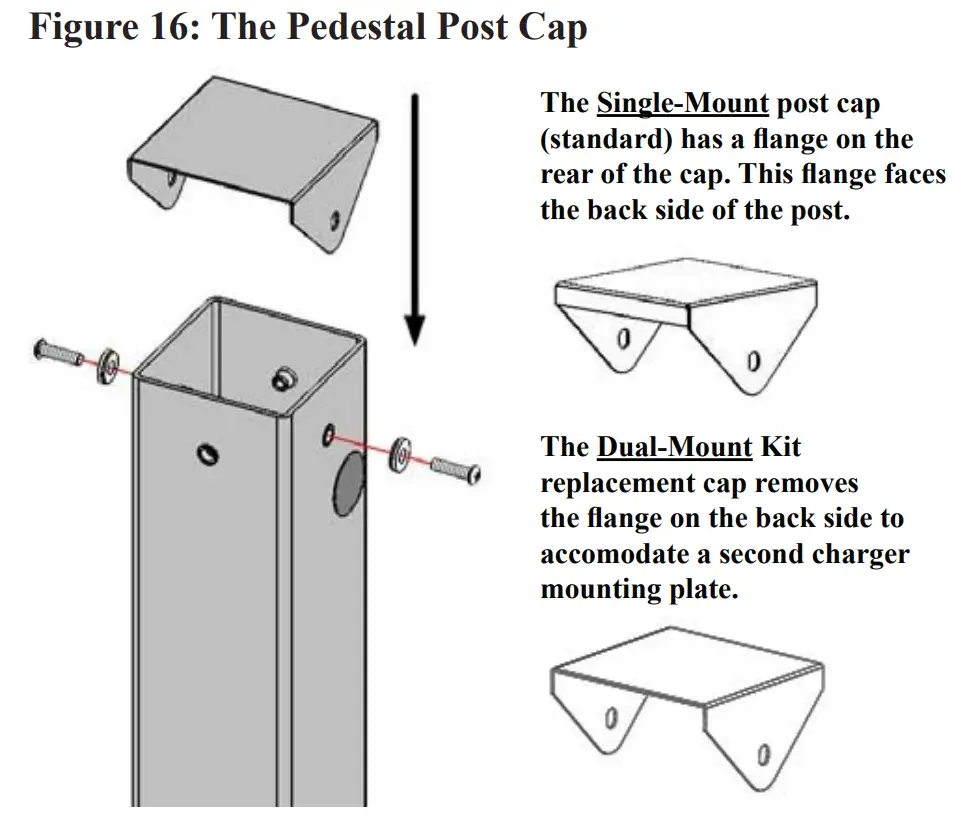 - Single-mount EVSE installations utilize the standard post cap provided in the pedestal kit. This post cap includes a flange on one side. Place the post cap onto the top of the pedestal, with the flange facing the rear.