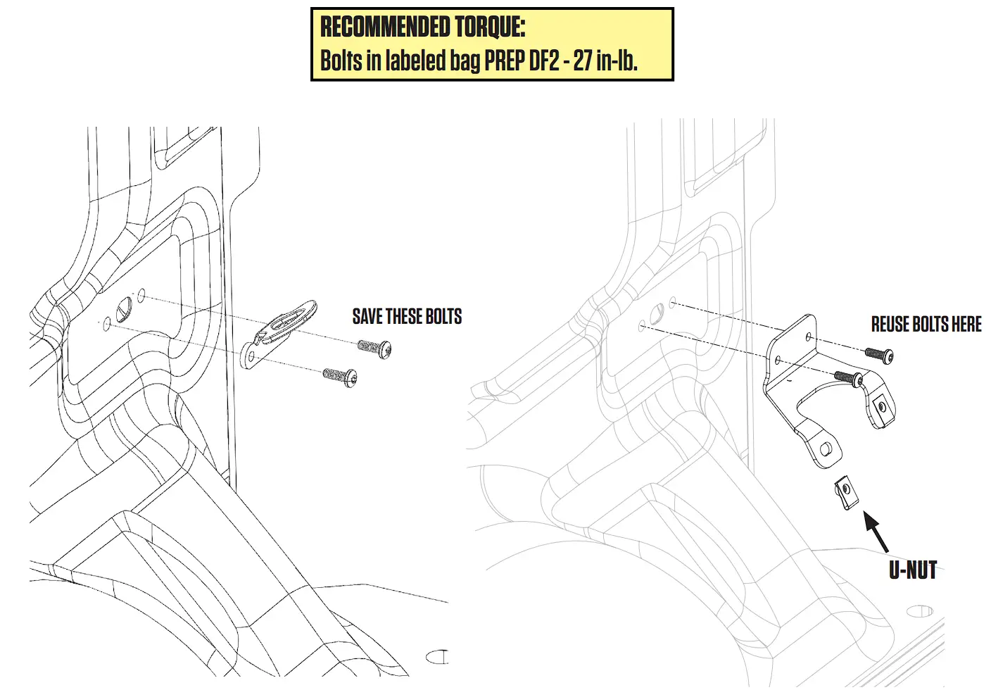 | RECOMMENDED TORQUE: 1” Bolts – 27 in-lb. | 1/2” Bolts – 18 in-lb. |