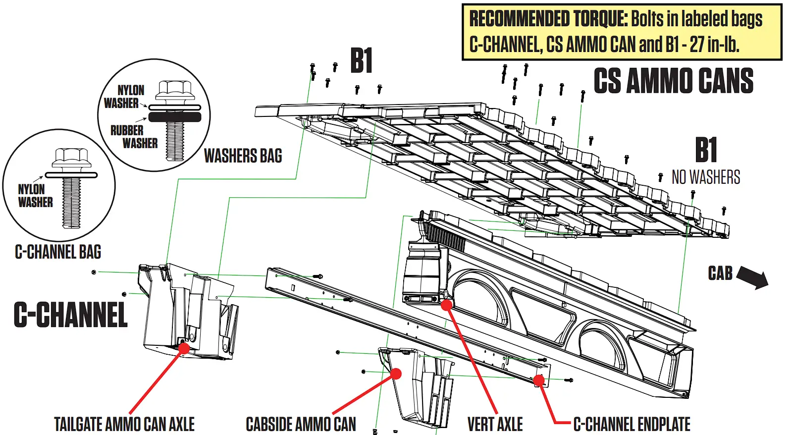 - Use WASHERS bag to install nylon & rubber washers on allCS AMMO CAN bolts. Install the same washers on 12 B1 bolts.