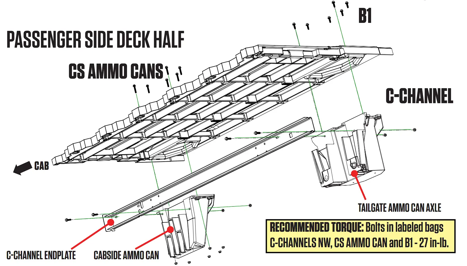 - Use the above bolts to bolt the deck to the ammo cans; BAG B1 for the tailgate ammo can, BAG CS AMMO CAN for the cabside ammo can.
