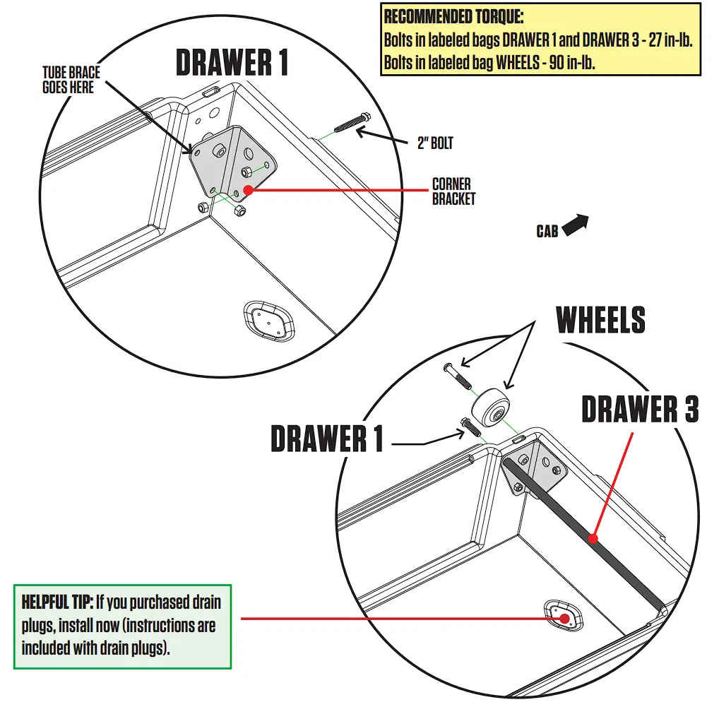 - Install a tube brace in each drawer with two 3/4″ length bolts; BAG DRAWER 1, BAG DRAWER 3.