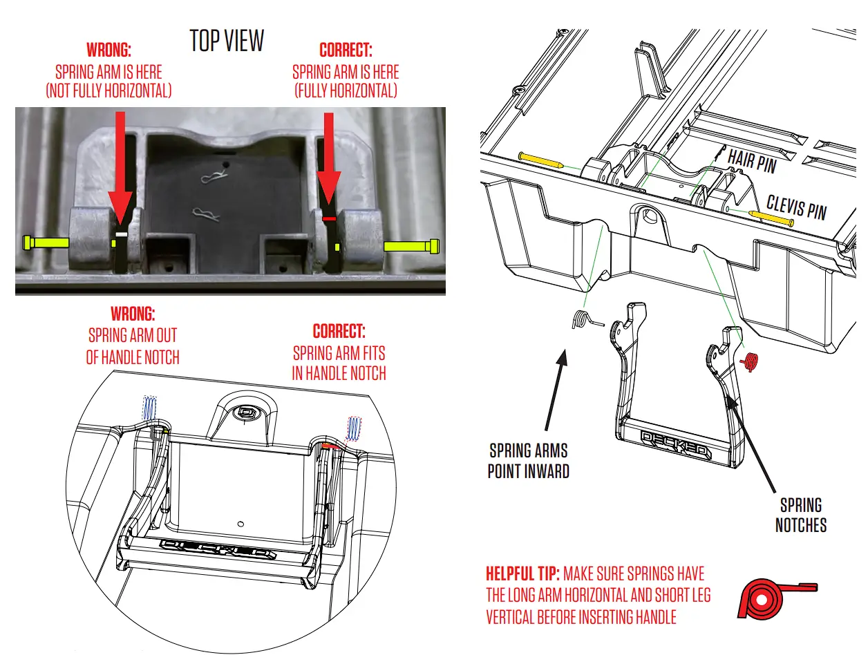 - With DECKED logo facing outward, insert the handle ends behind the spring arms. Rotate the arms of the handle toward the clevis pins, pulling the spring arm downward. When the handle hole is lined up with the clevis pin, push the pin through the handle hole and through the inside drawer hole. Repeat on the other side of the handle.