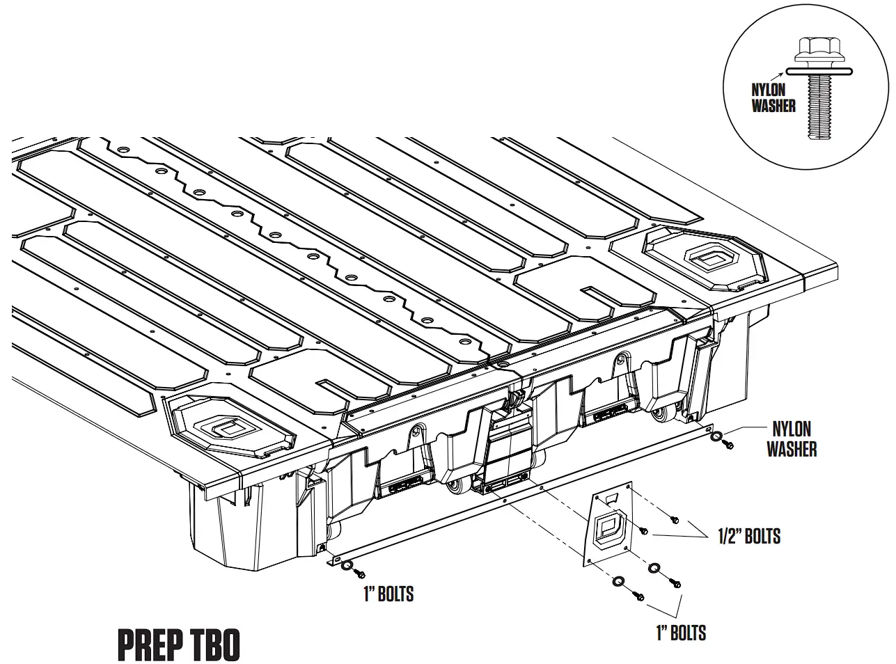 Make sure to SAVE THE FACTORY FORD BOLTS, as you will need them for the DECKED brackets. - Install DECKED tie-down brackets and U-nuts on both sides of truck using bolts from step above; BAGPREP DF2.