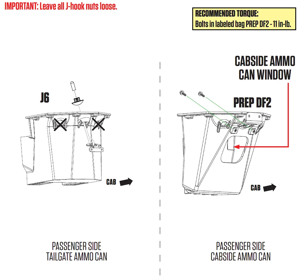 - Bolt the passenger side cabside ammo can to the tie-down bracket using the 1″ bolts through the two oval-shaped holes that are directly above the cabside ammo can window; BAG PREP DF2. Don’t tighten yet.