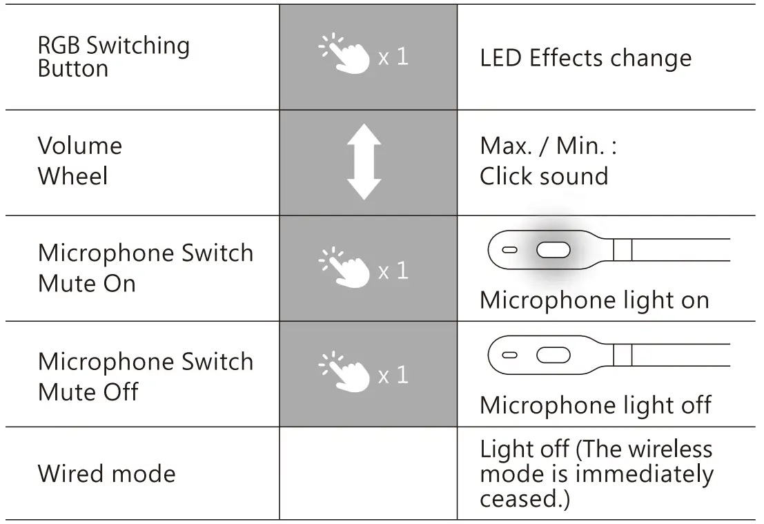 The Detachable Microphone, RGB LED Effects Button, Volume Wheel, and Microphone On/Off button are all inoperable during the wired mode