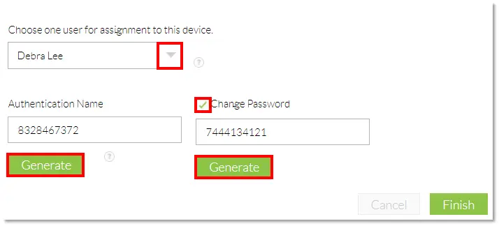 - Click the drop-down arrow under Choose one user for assignment to this device to select a User to assign the device to. Click the Change Password check box, then click the Generate buttons to generate new authentication details (Figure 1-3).