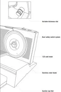 The high quality German circular blade is specially designed for precise slicing of meats, cheese, fruit, vegetables and breads. - Suction cup feet