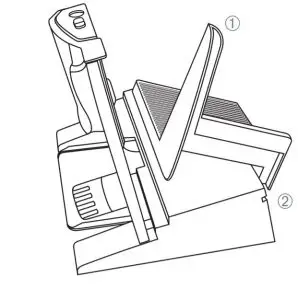 - Tilt the sliding food guide at approximately 45° angle ➀ and place the guide in the grooves of the base ➁. Lower the carriage onto the base. See Figure 1