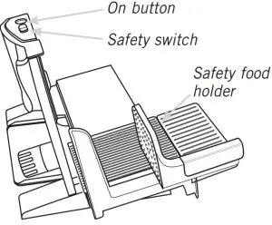 - To operate the food slicer, grasp the safety food holder firmly with your right hand and push the safety switch forward with the left hand. Without releasing the safety switch, press down the ‘ON’ button at the same time. Keep pressing down the dual safety switch during slicing. See Figure 6