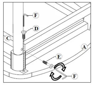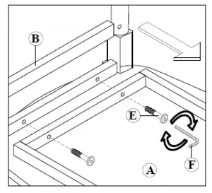 - Attach Leg (B) to the Top Table (A) by aligning into wooden Frame holes, and secured by Longer JCBC Bolts (E). Tighten by using Allen Key (F).
