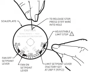 The “fan-off” lever is set at 120° F. (Lower setting will decrease fan off time, higher setting will increase fan off time.)