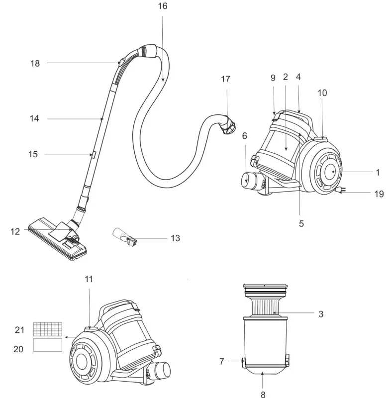 | 1. Wheel 2. Dust collector 3. HEPA Filter 4. Dust collector handle 5. Dust collector top part 6. Sucking inlet 7. Dust collector bottom release button | 8. Dust collector bottom 9. Dust collector lock button 10. ON/OFF button 11. Power cord winding button 12. «Floor/carpet» nozzle 13. «Furniture/slot» nozzle 14. Retractable tube | 15. Retractable tube length adjuster 16. Hose 17. Hose locks 18. Hose airflow control switch 19. Power cord and plug 20. Grid 21. Sponge filter |