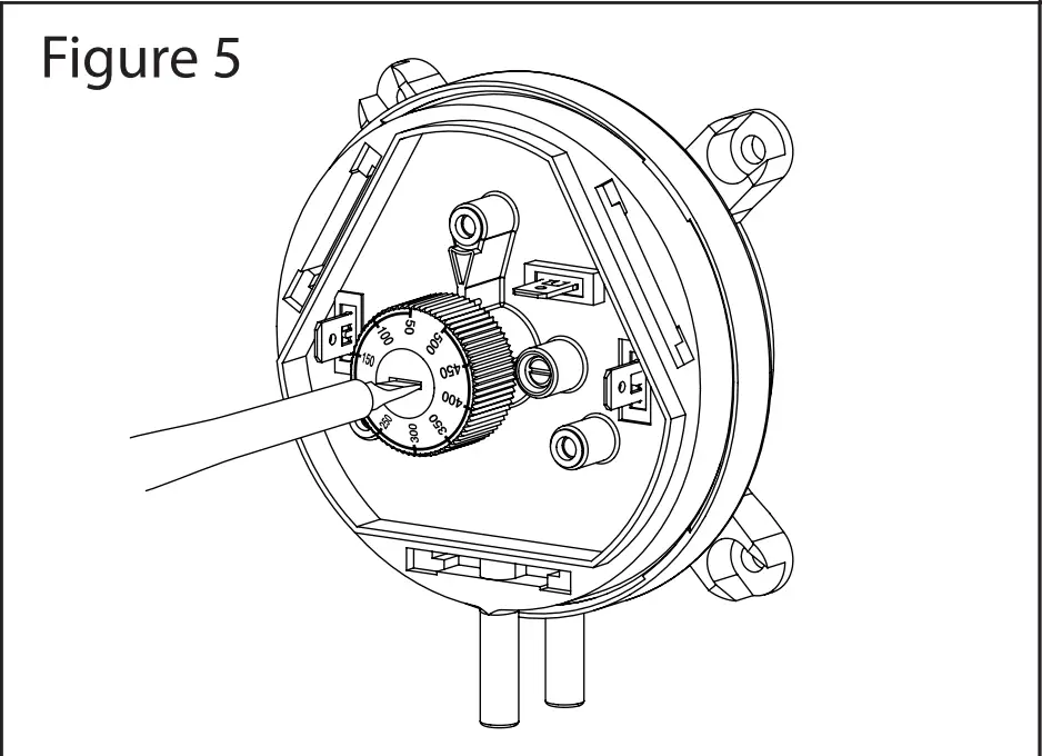 Set the desired pressure trip point (which trips at increasing pressure) using a flathead screw driver. The switch returns to its resting position as soon as the pressure falls below the set switching differential. See Figure 5.