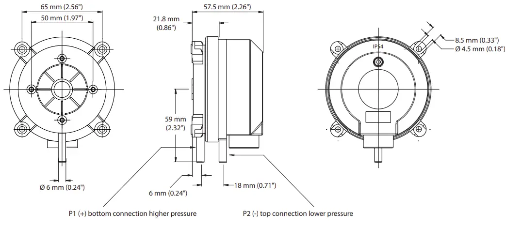 | Pressure Connectors | P1 (+): Connection to higher pressure P2 (-): Connection to lower pressure |