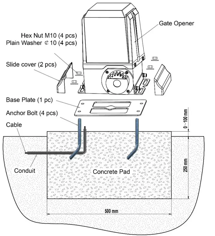 - Thoroughly fasten the four nuts as well as spring washers onto the expansion bolt tightly, enabling the opener is firmly secured on the concrete pad during the whole gate travel.
