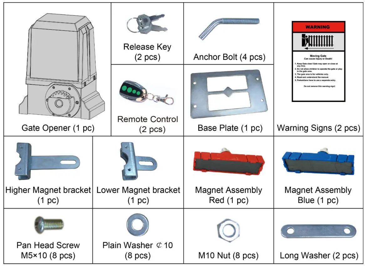 Before installation, please make sure that the gate itself can be opened and closed smoothly & freely BY HAND WITHOUT THE GATE OPENER.
