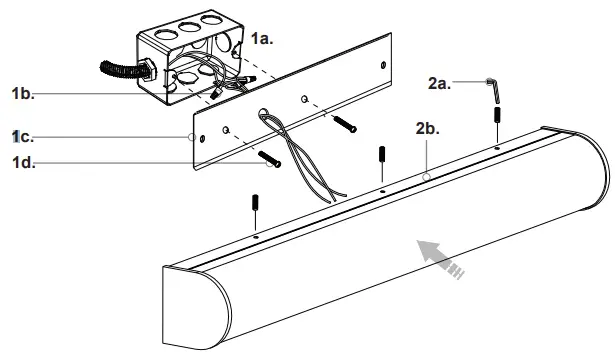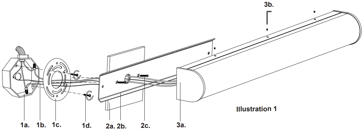 - Remove the fixture from its original packaging. Remove the crossbar (1c) from within the fixture (3a) by unthreading the set screws (3b) and two screws (2c). Attach the crossbar (1c) to the electrical junction box (1a), using screws (1d) provided in the hardware package.