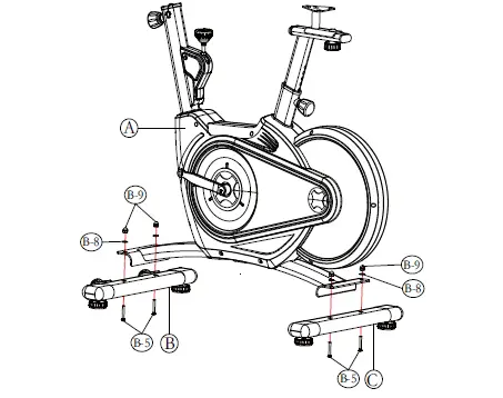 Shown as in the picture, use two pieces of carriage screws(B-5) MB”56, two pieces washers-8) DE°D20 and wo piece high belt caps(B-9) MB to install the rear feet pipe{C) on the main frame (A), use the configured tool (M) ighty lock the screws; tightly lock the front feet pipe(B)on the frame (A) through the same above steps