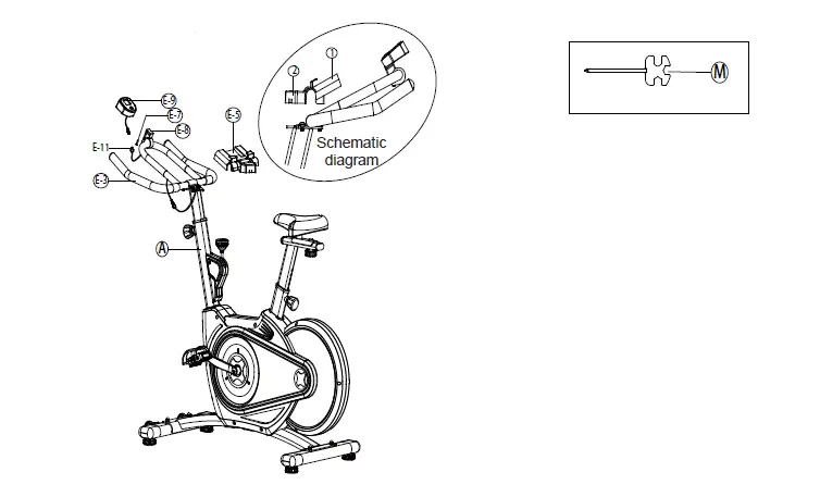 Firstly make the electric meter base into the bending pipe central position of the handrail (E-3), use 1 piece MA4 bal head Cross screw (E) pro-tight it, then connect the meter wire with the meter dawn wire (E-11), then buckle the meter into electric meter base, eighty locks the screw (E-7) after adjusting the position and angle well. Mobile phone bracket installation: hand hold position 1 in a diagram, put the mobile phone bracket on the handrail, down press it, buckle the mobile phone bracket on the down steel plate, then force to press position 2 of the mobile phone bracket, reverse buckle on the iron plate of handrail vertical pipe.
