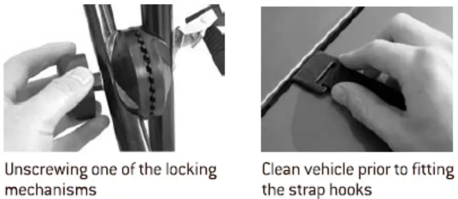 - Fix the two upper strap hooks ( in a secure place) on the rear of the vehicle or seals around the rear vehicle boot.