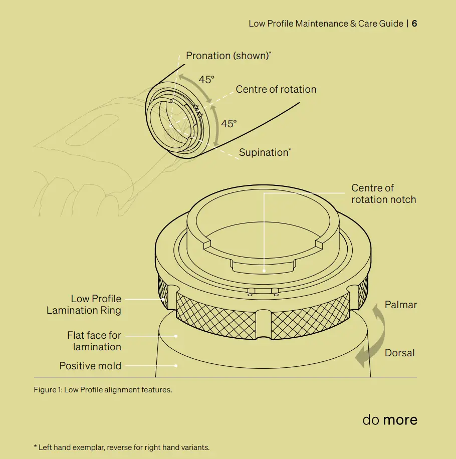 Verify the dorsal alignment of the hand and socket is correct prior to laminating. The dorsal midline of the hand will align with the centre of the rotation notch when the hand is in a neutral position. Ensure the lamination ring is in the correct orientation prior to lamination. Incorrect lamination will likely result in re-fabrication of the forearm. See the lamination procedure for further details.