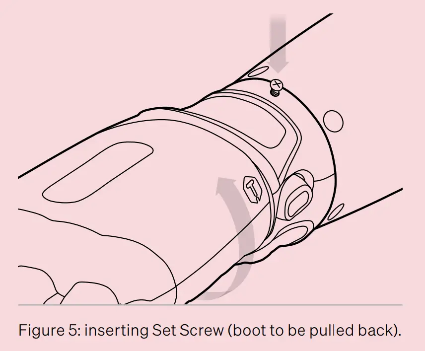 - Pull the silicone boot back and thread the screw into the hole (see figure 5 below). The screw (which provides an end-stop for the rotation) is intended to bottom out before the head is flush with the collar. Do not overtighten.