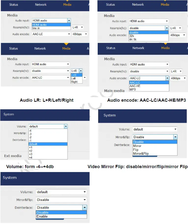 Media page includes video encoding parameters for the stream setting, such as Mirror, flip and deinterlace setting, output OSD subtitles and bmp LOGO, as well as audio input setting, Audio resampling, audio encode, volume control etc.