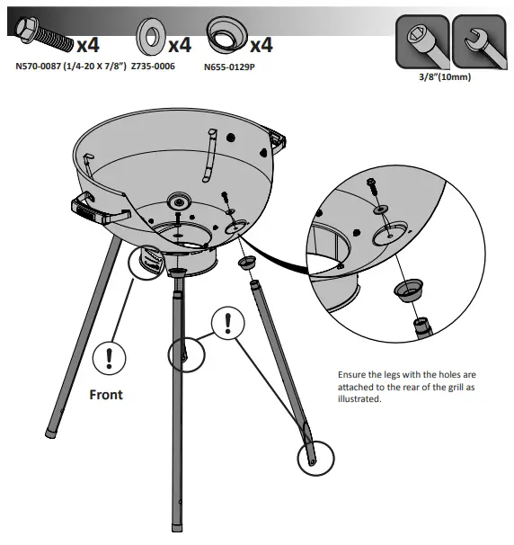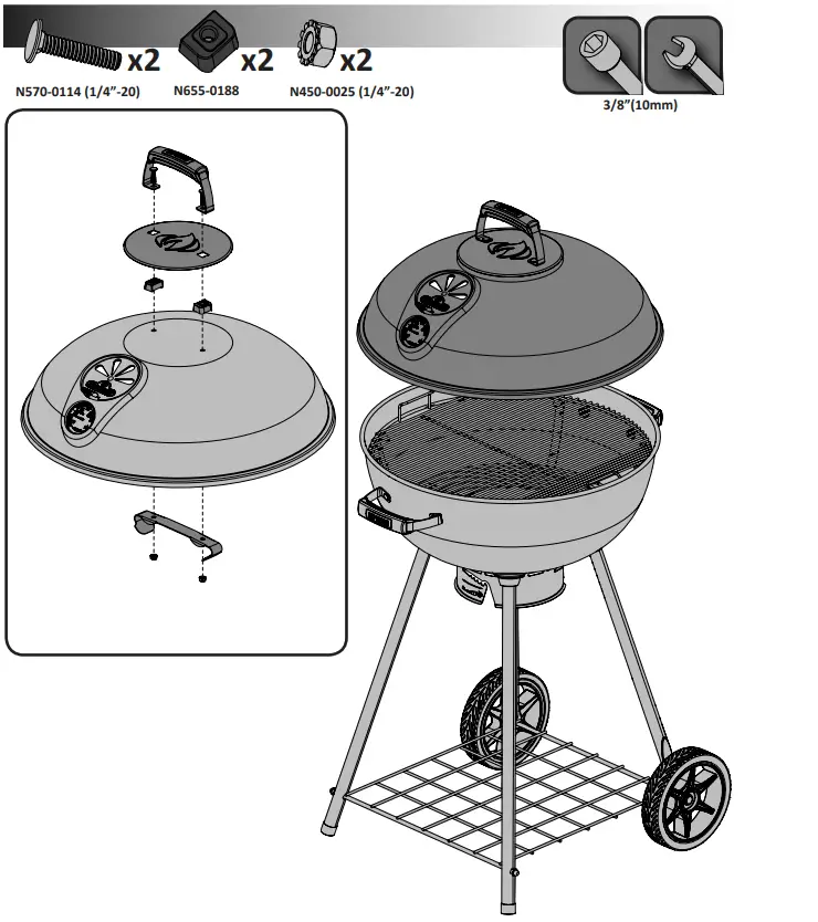 - Assemble the grill where it is to be used, lay down cardboard or a towel to protect parts from being lost or damaged while assembling.