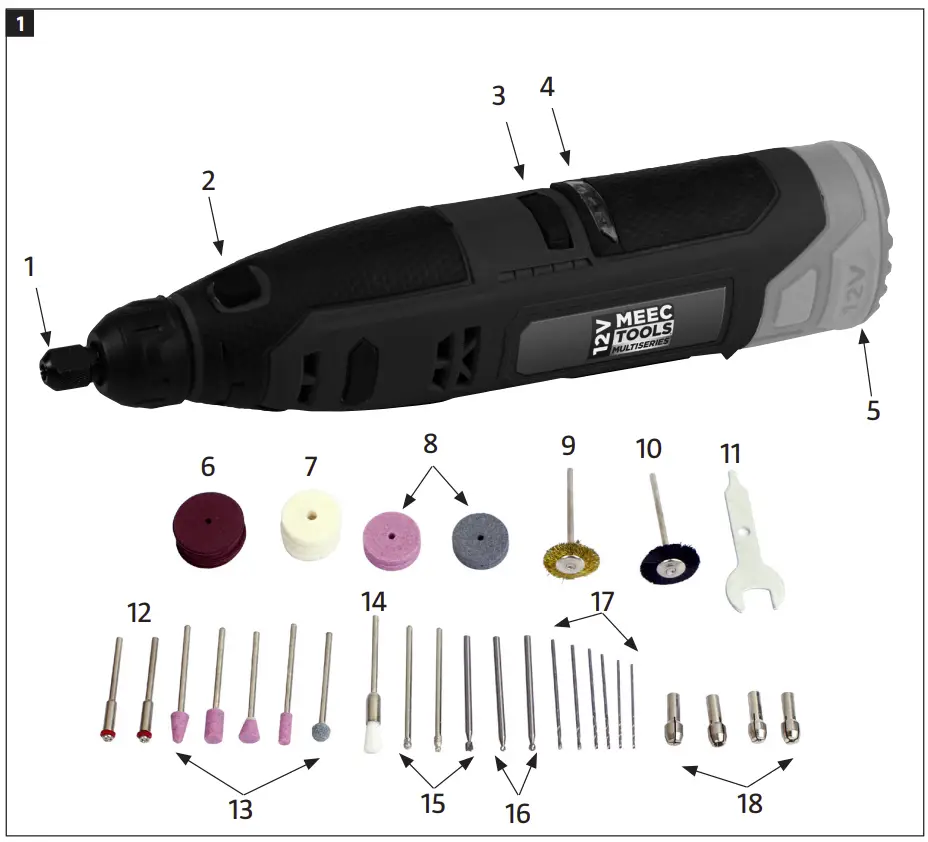The product is intended for drilling, routing, engraving, polishing, cleaning, grinding and cutting materials such as wood, metal, plastic, ceramic or stone. The product must only be used in dry areas and with accessories recommended by the manufacturer. Product contains 50 accessories. The product is only intended for household use.